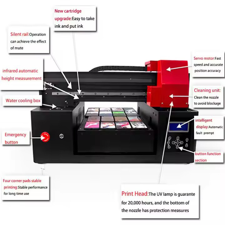 Ультрафиолетовый плоский принтер A3 является идеальным решением для самодельной индивидуальной печати на продуктах,который является многофункциональным светодиодным УФ плоскостным принтером, созданным DOMSEM и построенным с промышленной конфигурацией в виде толстого алюминиевого профиля, система охлаждения циркуляции воды. Автоматическая система выдержки УФ, 6 цветов и максимальное разрешение печати 2880 dpi. Может печатать на всех типах поверхностей, доступны в 3D текстурированной и поднятой печати,подходящий для печати как на жестком, так и на гибком материале, такие как телефонные чехлы, металл (алюминий, медь и т.д.), сплавы, зеркало, упаковка для подарков (дерево, углеродная бумага, металл), крышка планшета, USB-накопители, DVD-диск, отраслевые знаки, значок, пластиковая карта, ПВХ, стекло,древесина, бумаги и т. д. УФ-принтер A4 является идеальным решением для самодельной печати на продуктах,который является многофункциональным светодиодным УФ плоскостным принтером, созданным DOMSEM и построенным с промышленной конфигурацией в виде толстого алюминиевого профиля, система охлаждения циркуляции воды. Автоматическая система выдержки УФ, 6 цветов и максимальное разрешение печати 2880 dpi. Может печатать на всех типах поверхностей, доступны в 3D текстурированной и поднятой печати,подходящий для печати как на жестком, так и на гибком материале, такие как телефонные чехлы, металл (алюминий, медь и т.д.), сплавы, зеркало, упаковка для подарков (дерево, углеродная бумага, металл), крышка планшета, USB-накопители, DVD-диск, отраслевые знаки, значок, пластиковая карта, ПВХ, стекло,древесина, бумаги и т.д.